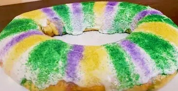 The tour included a short film that gave some of the history of the Mardi Gras parade. After the film we were served some of the delicious King Cake. Guy stood in line twice and had two pieces. “I’m hungry” he said. The King Cake is a Mardi Gras tradition. It is made in the traditional three colours of Mardi Gras: purple representing justice, green representing faith, and gold representing power. The cake tastes like a light cinnamon roll with icing and it is quite delicious. At a Mardi Gras party, the king cake is served and if your slice contains the small baby, you are declared “king for the day” and based on Mardi Gras custom you must host the next party. Originally, the baby was placed in the cake to symbolize the baby Jesus. After eating our cake we started our tour of the 300,000 square foot warehouse where the floats are constructed.