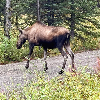 Leaving the dogs behind we started our way towards Denali State Park. And it finally happened! After all this time and distance traveled we got to see a moose up close. We have seen a few moose but never this close. She was literally just standing on the side of the highway munching on leaves. We had the pleasure to stop and watch her. When I rolled down my window we were close enough that we could hear her munch on plants and leaves. Interestingly, she was just eating the top portion of the branches, this way she did not have to bend all the way down. We have been wanting to see moose up close since we started this trip 18 months ago. Always in a good way of course, not jumping out of a ditch and on the road in front of our Roadtrek. Finally, our wish came true. What an absolutely beautiful creature she was.