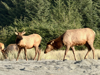 And even after we said no more rough dirt roads, here we are traveling down yet another dirt, winding, potholed, mucky road to Gold Bluff Beach Campground and a hike to the Fern Canyon. Unfortunately the road onwards to the Fern Canyon was washed out with creeks crossing, so we were unable to go, but we did enjoy a few wonderful and peaceful days at the campground. This is not a big campground and the sites are a bit small and more designed to accommodate tents then RVs. Thankfully Roadie is under 20 feet and fitted perfectly. The sites are right on the beach and we could hear the waves crashing on the shore all day and night. And, lucky for us we even saw a herd of elusive Roosevelt Elk wandering along the beach and into our campsite. Elks on the beach seems a bit odd as back home we associate elks with mountains, but we are in California now and there are some low mountains in the background.