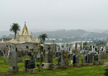 And to end of our day we needed to empty and refill Roadie which cost us a total of $40usd to sani-dump and refill with fresh water, ouch! California you are expensive. We boondocked at a Casino just outside of San Francisco in Colma which is known as “City of Souls”. This small town with a population of around 1,600 has 17 cemeteries that hold over 1.5 million buried souls. It is said that the dead far outnumber the living here. The casino parking lot is surrounded by cemeteries front and back. Well at least it was a quiet spot to boondock, neighbours were not rowdy at all. We did a few neighbourhood walks here with Treme and came across a few interesting things. As mentioned we are surrounded by cemeteries, Chinese, Italian, Japanese, Catholic, etc, and the grounds are filled with simple and elaborate grave sites. In all our travels to different cemeteries, we have never come across a gravesite that has a “For Sale” sign - this is a first. Perhaps the sign should say, “For sale, used but like new condition”, too funny. Another interesting object here is the “Cemetery Worker’s Bell”. This bell used to hang in a tower in a cemetery. When the bell rang it signalled to the workers that there was an approaching funeral. The workers would quickly change into their formal uniform and participate and help with the funeral. Back in the days, pretty well all cemeteries had these bells. Now the most intriguing is “The Mystery Tombstone”. This is one of the oldest tombstones found here in Colma and marks the grave for a H.J. Hartnagle who died in 1875 at the age of 29 years old. This tombstone was originally located at the Odd Fellow Cemetery in San Francisco. Back in the 1930s, the courts decreed that all bodies in existing San Francisco cemeteries be removed. This was due primarily to the pressure of finding “prime real estate” for the growing population, plus many of the cemeteries were in need of repair, as well there was a concern for public health. Hartnagle's remains, along with many others, were transferred to a mass grave site at Odd Fellows Cemetery in Colma. During the transfer, the tombstone was somehow separated from the body. It may have accidentally fallen from a railroad car or may have been discarded as many tombstones were when San Francisco cemeteries were evicted. Individual tombstones were prohibited at these mass grave sites. Fast forward to 2001, H.J.Hartnagle’s tombstone was found near the Holy Cross Cemetery during construction that was happening in the area. It may never be known what exactly happened to the tombstone and it remains a mystery still.