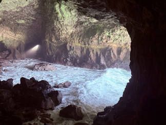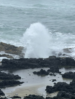 We continued heading down the coast towards Cape Perpetua to see Thor’s Well. To reach the site we hiked a 2 km trail, you guessed it, in rain, wind, and ocean mist. Everything was dripping wet and cold but the scenery was well worth the effort. Thor’s Well is like a geyser, as the waves crash onto the rocks, water spews straight up into the air through a hole in the rocks. The well started out as a sea cave dug out by the waves, and eventually the roof collapsed and created openings at the bottom and top through which the ocean waves splash through. The hole is around 20 feet deep. It is known as the drainpipe of the Pacific - it actually is a hole in the rock that appears to drain water from the ocean each time the waves crash into it. The spectacle was powerful and magnificent. It was amazing to watch as some of the waves were at least 20 feet high approaching the shore.