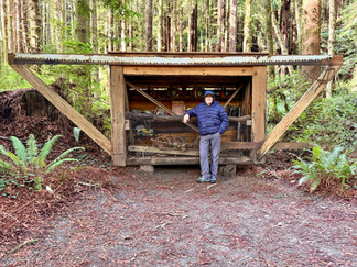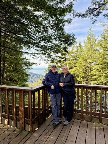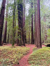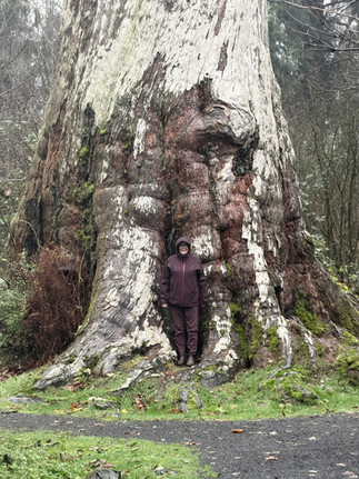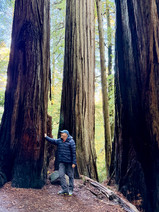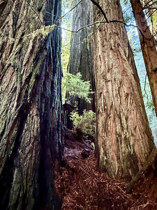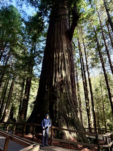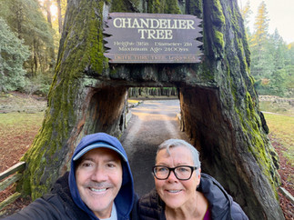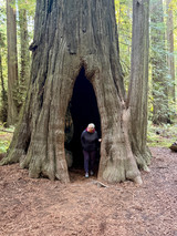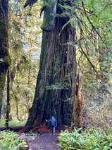 After about 30 minutes of very slow driving, we stopped at a parking area where we could hike the Grove of Titans Trail. This majestic tree grove at the end of the trail contains many tall, wide, and massive redwoods and sequoia trees. This area has been known by indigenous people for thousands of years. One tree, which we had a photo taken in front of, we were told is 1300 years old, and may be older. In the late 1990’s this grove of trees was "re-discovered" and named “The Titans”. Many people started coming to see the trees and much damage was done to the forest from people trampling all over to see them. In 2022 this new walking trail was completed with 1500 feet of elevated boardwalk built to protect the forest floor and to allow people easy access to the giants. The trail is fascinating to walk along; at times even difficult for us as we kept staring upwards in awe and forgetting to look down at our feet and watch where we were walking. We made so many stops along the way to take photos which Guy kept saying “these photos cannot do this place justice”. “These photos cannot possibly show the sheer size of these trees.” After about a half hour of trekking, we reached the Grove of Titans and we were absolutely awestruck at the sheer size of the trees. They are monsters in comparison to what we know as “large” trees in Canada. The only possible comparison in Canada would be the trees at Cathedral Grove on Vancouver Island.