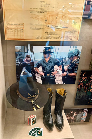 The Coppola Winery Movie Museum. This winery sits on a 57 acres. We must say that driving down the long elegant driveway to the winery was a bit intimidating for us with its grandiosity and with a bit of that Hollywood flare. Although we both like our wine we did not come here for the wine, we came to check out the movies exhibits. The winery is stunning though with different bar areas for wine tasting and a restaurant serving martinis. We were surprised to see so many people here on an early Sunday morning already enjoying the wines. We wandered around and admired the exhibits. One of our highlights was seeing, touching, and standing in front of the original desk that was used in all three of the Godfather movies. We could sense the imposing importance of this piece. Another highlight was seeing a second draft script of the first Godfather movie, of course behind glass. There was a display of all the oscars, nine in total, and awards won for the Godfather trilogy movies. There is Dennis Hoppers’ outfit and cameras, Robert Duvall’s cowboy boots and cavalry hat, as well as a pile of skulls, arrows, and a bamboo prisoner cage from the Apocalypse Now movie. There were photos of Marlon Brando and other cast members. The walls are full of movie posters and family photos.