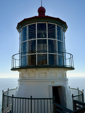 Next stop was a 20 minute drive to the Point Reyes Lighthouse. To reach the lighthouse, there are 313 steps down to it and 313 steps back up. It is well worth the huffing and puffing though as it really is beautiful. We did huff and puff up and down but there were younger folks attacking these stairs two steps at the time and barely breathing hard - oh to be young again. This place, we were told, is considered the windiest and the foggiest place along the entire west coast. The wind can reach up to 40 MPH. A sign also said that Point Reyes is the second foggiest place in North America after Grand Banks in Newfoundland which is number one. We are well aware of this as we experienced the thick fog in Newfoundland two summers ago. Lucky for us, today at Point Reyes it was beautiful and sunny. The sky was clear, and there was not a wisp of wind in the air. The Lighthouse was built in 1870 to warn ships heading towards San Francisco Bay about the rocks along the north coast. Unlike most lighthouses, which are built tall for visibility, Point Reyes Lighthouse is only 35 feet tall and stands on the very edge of a steep rocky cliff 265 feet above sea level. Mariners could see its light beneath the high thick fog that often cuts across these cliffs. In the 1906 San Francisco earthquake the lighthouse was shifted north by 18 feet along the San Andreas Fault, but suffered very little damage.
