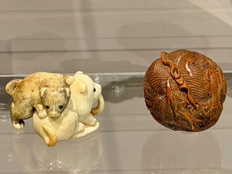 In the museum there is a display of Japanese Netsuke. Netsuke are intricate miniature Japanese sculptures originally used to secure the cords of a person's sagemono (personal pouch) the small container that hangs from the kimono belt (obi). As Kimonos do not have pockets the sagemono contained a person's everyday essentials and money. Netsuke were a necessary fashion accessory. They were worn by both everyday and wealthy people. At first glance these small carvings appear to be just small decorative figurines, but with a closer look small holes in the carvings where the cords were laced through can be seen, making these Netsukes.