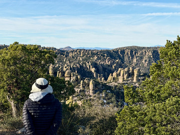 That evening we drove to the Chiricahua National Monument. Because the campground was completely booked we decided to boondock for the night on the side of the road just outside the park. We had a wonderful peaceful night viewing a beautiful colourful sky with the backdrop of the Chiricahua Mountains - another one of our amazing boondocking moments to remember. The Chiricahua Mountains are referred to as “sky Island” for their unique features of volcanic rhyolite pinnacles and balanced rocks which were created through a combination of volcanic activity and millions of years of erosion. In the early morning we started the 16 km scenic Bonita Canyon Drive to Masai Point which is 6,970 feet above sea level. Along the drive we stopped to admired the Organ Pipe Formations. This is a huge wall of hoodoos formations that resemble organ pipes, they are a few hundred feet tall and are over 27 million years old. Guy calls them “natural sculptures” and they are spectacular. How do these giant rocks possibly stay balanced on top of each other?Some look like they are hanging by only a tread - a little worrisome, to say the least, as we walked below them. The drive was full of so many awe moments and surrounding beauty. At the top of the mountain we did a few short hikes and were even greeted with snow on the paths. It was cold but it felt good to feel that crispness and lightness of the air. And the views of course were breathtaking.