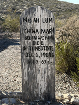 One of the stories in Tombstone is about Sing Choy known as "China Mary". China Mary is a pseudo name that was given to multiple Chinese women who immigrated to the United States in the 19th century. Sing Choy was known as the "Godmother" of her community of the Tombstone’s Chinese district and controlled much of it. She was an influential businesswoman finding jobs for Chinese labourers outside of the Chinese community and helping those in need. She managed a general store, gambling halls, brothels, and opium dens. She also managed the famous Can-Can Restaurant which was a famous fine-dining establishment known for serving exotic items like fresh oysters and shrimp which were transported by refrigerated railcars. She died in 1906 and was buried at the Boothill Graveyard. Her funeral was one of the most attended funerals in the Boothill Graveyard history.
