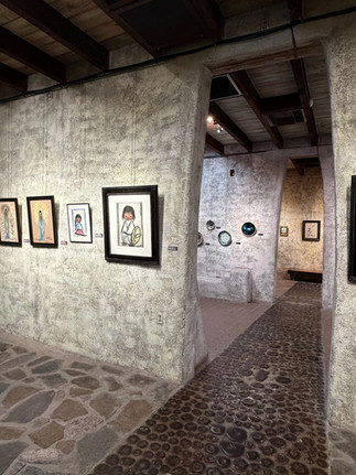 The main building came after and is over 16,000 sq ft with 13 rooms of art. Grass and mud mixture used in the walls construction, which is still clearly visible, adds to the beauty and decorative style of the building. Relief etchings and decorative bricks on the floors make the building itself an amazing piece of art. We were able to wander around the property and enter a few of the selective buildings. We visited the small chapel. We visited another building which is a small gallery built for visiting artists - at the time we visited we were please to witness a young lady working on her paintings. One of the buildings which she described to us as a “time capsule” was the original house where Ted and Marion lived.